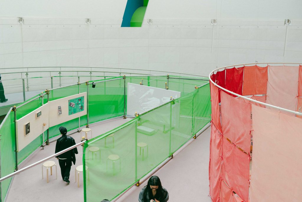 「この世界に生きること」——幾様にも応答可能なテーマを掲げた本学創立125周年記念展が、2025年10月29日(水)から11月3日(月・祝)まで、東京・南青山のスパイラルガーデンで開催された。本記念展は二部構成であり、このコラムで扱うPart 1は、本学出身の現代アーティスト3組4名の作品によって構成されている。本パートに参加したのは、サエボーグ、飯山由貴、繁殖する庭プロジェクト(小宮りさ麻吏奈+鈴木千尋)である。これらの作家たちおよび出展作について深く知る機会ともなる〈アーティストインタビュー〉https://lab.joshibi.ac.jp/interview/の制作には女子美ラボが関わっており、筆者も同年夏に行われたインタビュー収録の一部に同行した。展覧会初日の午前には、女子美ラボの企画・運営メンバーとともに会場を訪れ、会期スタート時における作家たちの発言を聞くための短い聞き取りを行っている。本コラムでは、会場で得られた作家たちの発言を中心に1、〈アーティストインタビュー〉同行時の所感なども織り交ぜつつ、展示会場の様子を伝えようと思う。