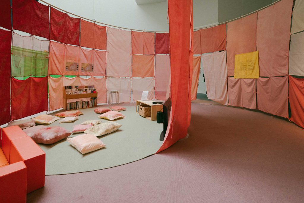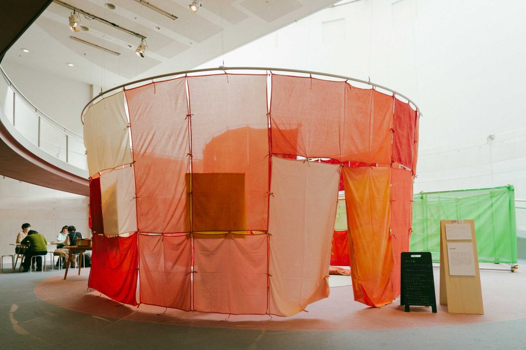 サエドッグに一旦別れを告げると、何十枚もの濃淡や色味の異なる赤い布が連結し、円筒状に形作られた空間がその先にある。今回、飯山由貴は、二つの新しい作品を見せてくれたが、その一つがこのインスタレーション空間で展開する《なざし なのり なづけ》である。それは、「日本軍による性暴力をうけ、生き残り証言をすることができた人たちと出会った人たちが、彼女たちから贈られて受け取った言葉と言語になりきらないさまざまなもの、例えば、視線、感情、体温などを私たちがふたたび受け取るために6」作られた。布は、日本国旗の染料としてかつて使用されていた「茜や、茜の下地染料になるようなもの」によって染められている。茜は赤系の天然染料であるが、言うまでもなく、作品コンセプトと密接な関わりを持つ素材である。染色は今回初めて着手する手法だというが、〈アーティストインタビュー〉同行時には、非常に丁寧な工程を踏んで作家が布を染め上げていく様子を見せてもらった。
