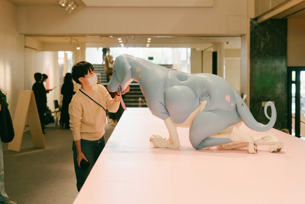 こうした手応えの前提として、「グループ展は自分の個展とは違うので、他の作品と一緒にどこか繋がって意味が出たり変わったりとか、見え方が自分だけでコントロールできるものじゃないってところで不安があったんですけど、ちょっと予想以上にうまくハマったっていうか、テーマが決してイコールなわけじゃないけど、どこか繋がっているところがある」という実感があった。作品をめぐる環境が変われば、たとえそれが同じボディスーツを着用していたとしても、行われるパフォーマンスは決して「反復」ではなく、その都度「常にすべて変わっていく」という意識がサエボーグにはあり、観客とのコミュニケーションも異なる。会期初日、夜まで会場に滞在していた筆者の目には、多くの人がサエドッグと交流する様子が映った。そのなかには、尊敬の念を抱かせるようなふるまいもあれば、どう接してよいのかわからず緊張する人の姿も見受けられた。他の2組3名の出展作家もその場を訪れており、サエドッグに静かに顔を寄せ、やさしく体を撫でる光景は、とりわけ強く印象に残っている。