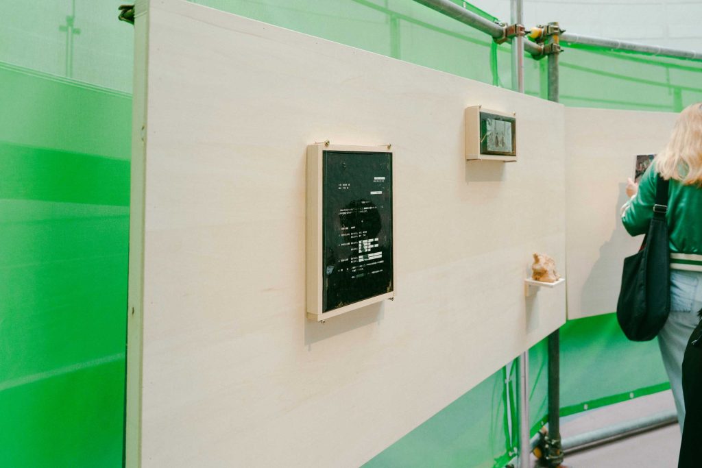 繁殖する庭プロジェクトの〈アーティストインタビュー〉には同行できなかったが、本記念展の少し前に京都市立芸術大学ギャラリー@KCUAで開催された、四組のアーティストによって構成された「包摂とQ」展(2025年8月17日–9月15日)では、本作がそのうちの一つとして出展されており、筆者も観客として足を運んだ。ここでは、その際に得た展示風景の印象との異同についても触れておきたい。京都の会場においても、フルバージョンの映画を含むインスタレーション形式で発表された。緑のネットで囲われた空間の面積や形態は会場によって異なり、東京での展示ではより広く面積がとられ、形状も相対的に縦長であった。なかでも最も大きな違いは、京都では映像スクリーンと視聴用の木製ベンチチェア二脚のみがその内側に置かれ、それ以外の作品群は空間の外に展示されていた点である。